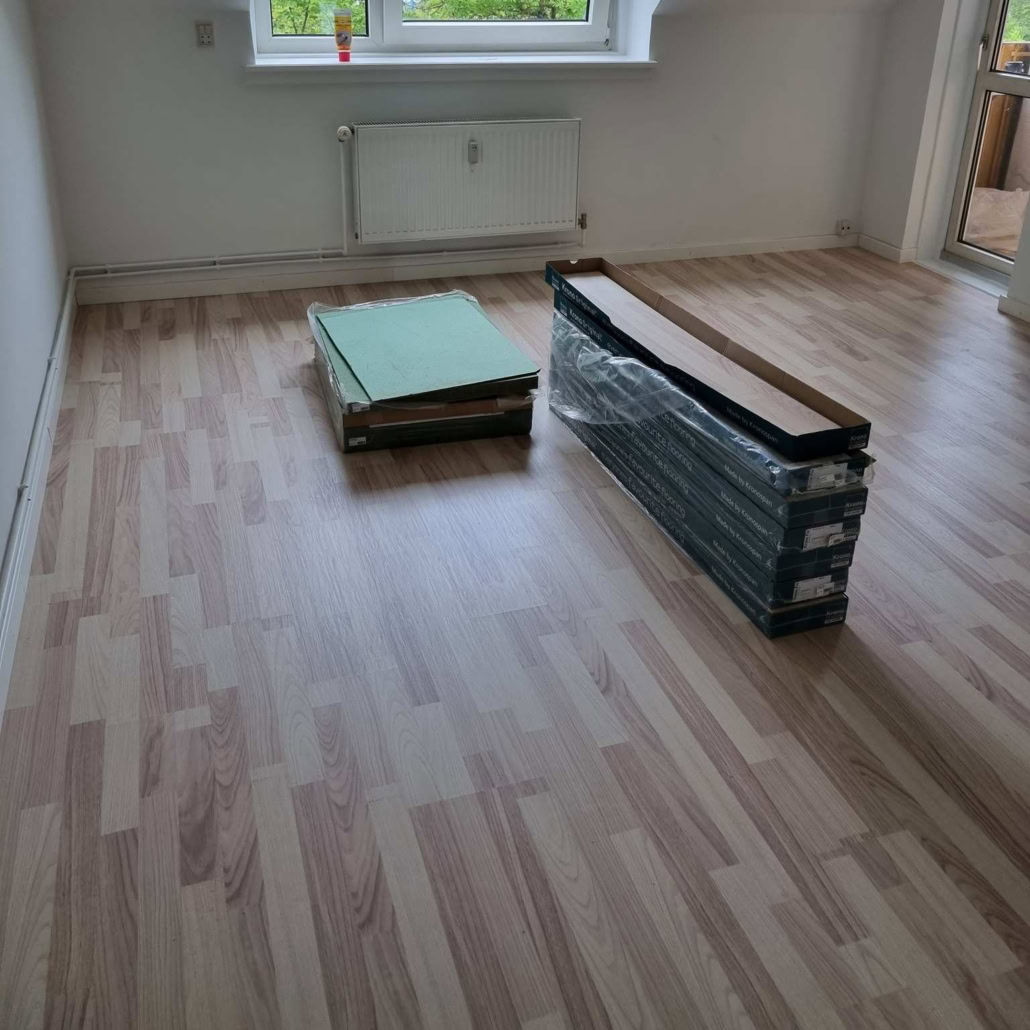 Vandskader kan være ødelæggende, men med det rette håndværk kan vi få rummet til at skinne igen! Vi har tidligere i år udskiftet gulvet i dette køkken og givet det nyt liv.